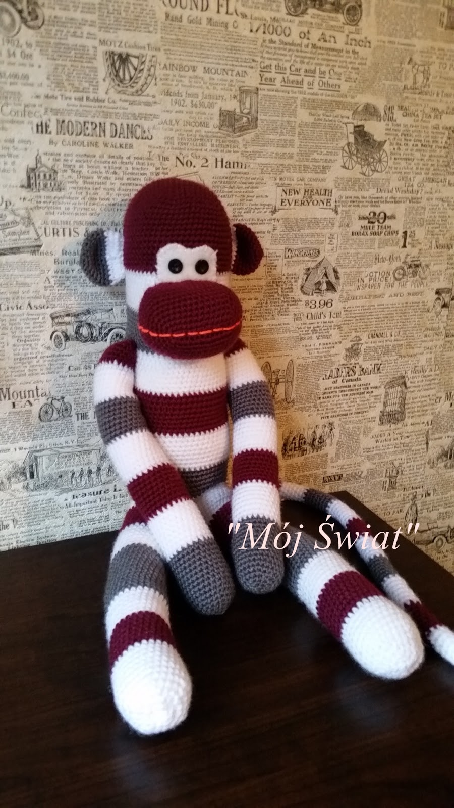 Skarpetkowa małpka tyle, że wydziergana na szydełku